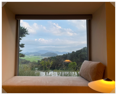 내부 통창을 통해 바라본 바깥 풍경은감탄이 절로 나왔어요.드넓게 펼쳐진 자연과 특히특히 하늘과 바다, 넓은 들과 산새가 어우러진 모습이한눈에 다 들어와서 눈과 마음을 즐겁게 해주었습니다.
