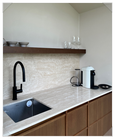 기본적인 주방 시설 및 어메니티 제공 작은 싱크대에 빌트인 냉장고와 캡슐커피, 차 포트, 와인잔, 찻잔 등 필요한 물품들이 깨끗하게 정리되어 있어서 찾기에도 사용하기에도 불편함이 없었어요.