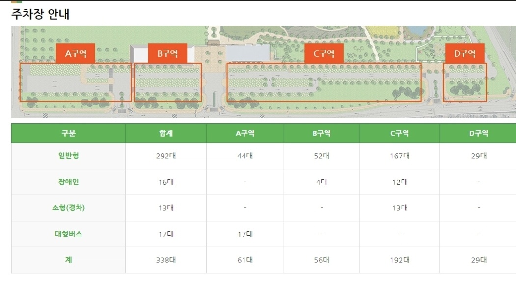 농업생태원의 주차구역은 총 4개 구역으로 나눠져 있습니다.